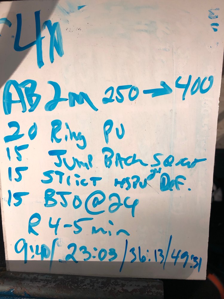 I rested exactly 5 minutes in between. The SHSPU I did 3-3-3–1’s, until the 4 round. I thought the tempo on the bike would be easy all 4 rounds. It got moderate on the last one. . SHSPU That was my time killer.