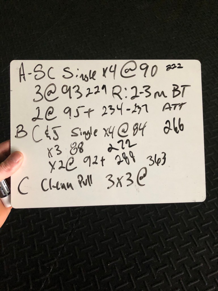 PM A – Below knee paused squat clean x 1/Squat clean x 1, rest 15 sec between reps and 2 min after set x 6 sets (working sets around 84%)