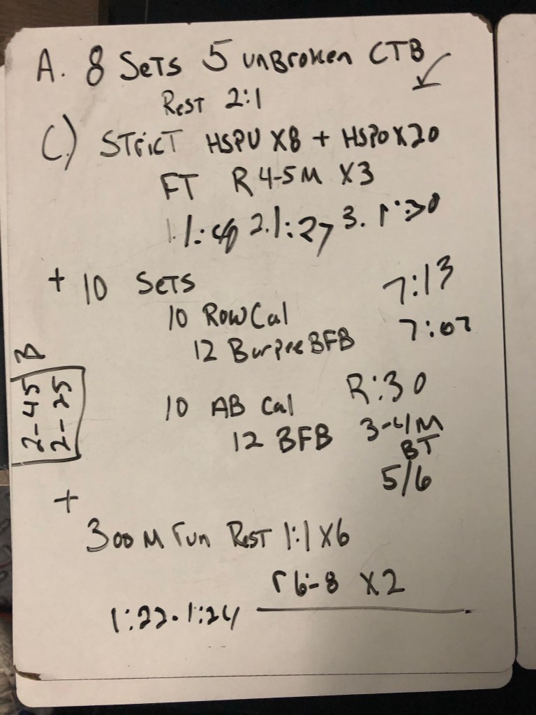 3/31 A – Chest to bar pullups – 8 sets of 5 unbroken reps for time, rest 2:1 x 2 sets (rest twice as long as it took to complete the 6 sets)